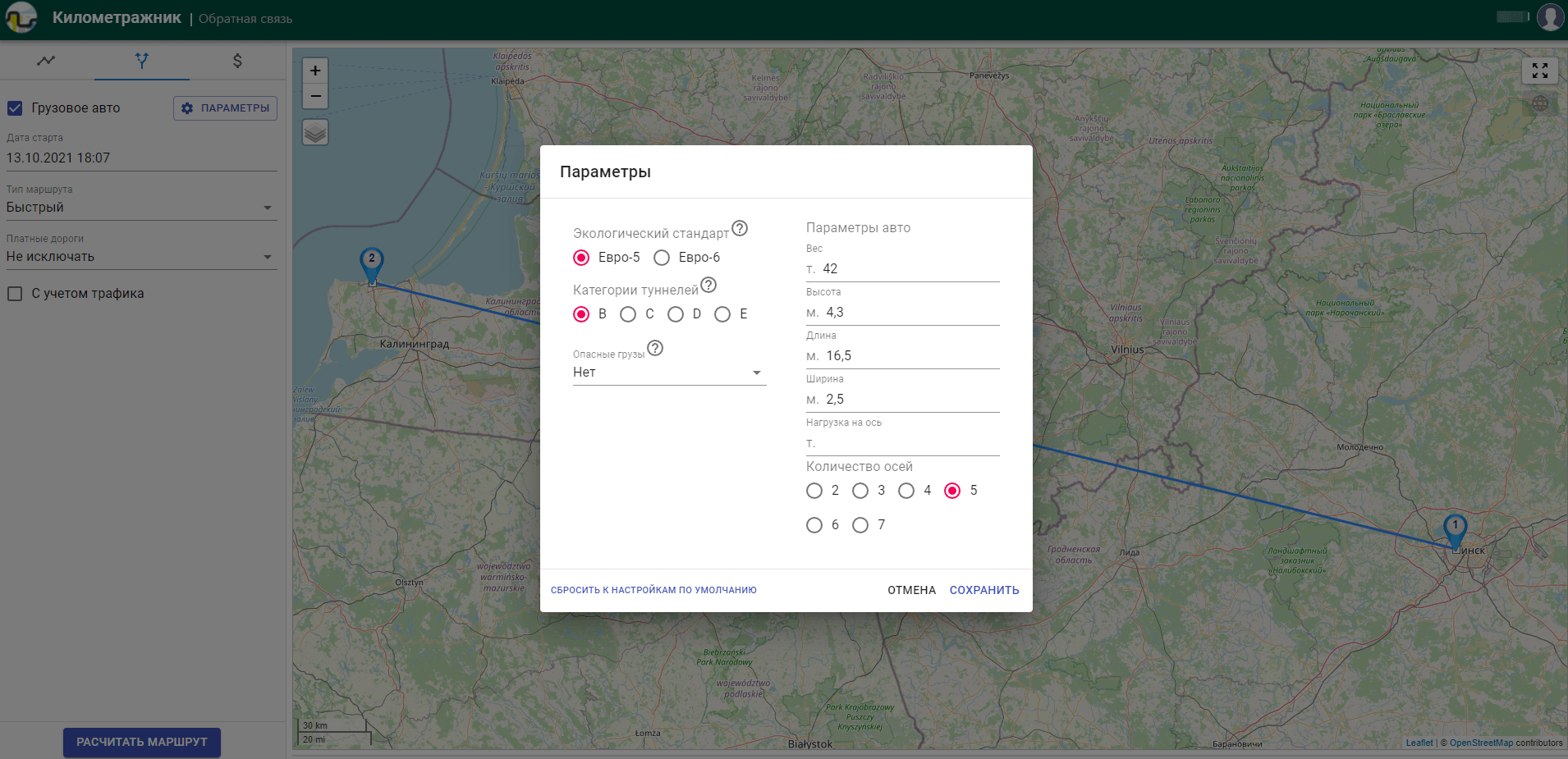 Сервис поможет построить оптимальный маршрут с учётом параметров автомобиля, а также рассчитать затраты на топливо и проезд по платным участкам дорог.