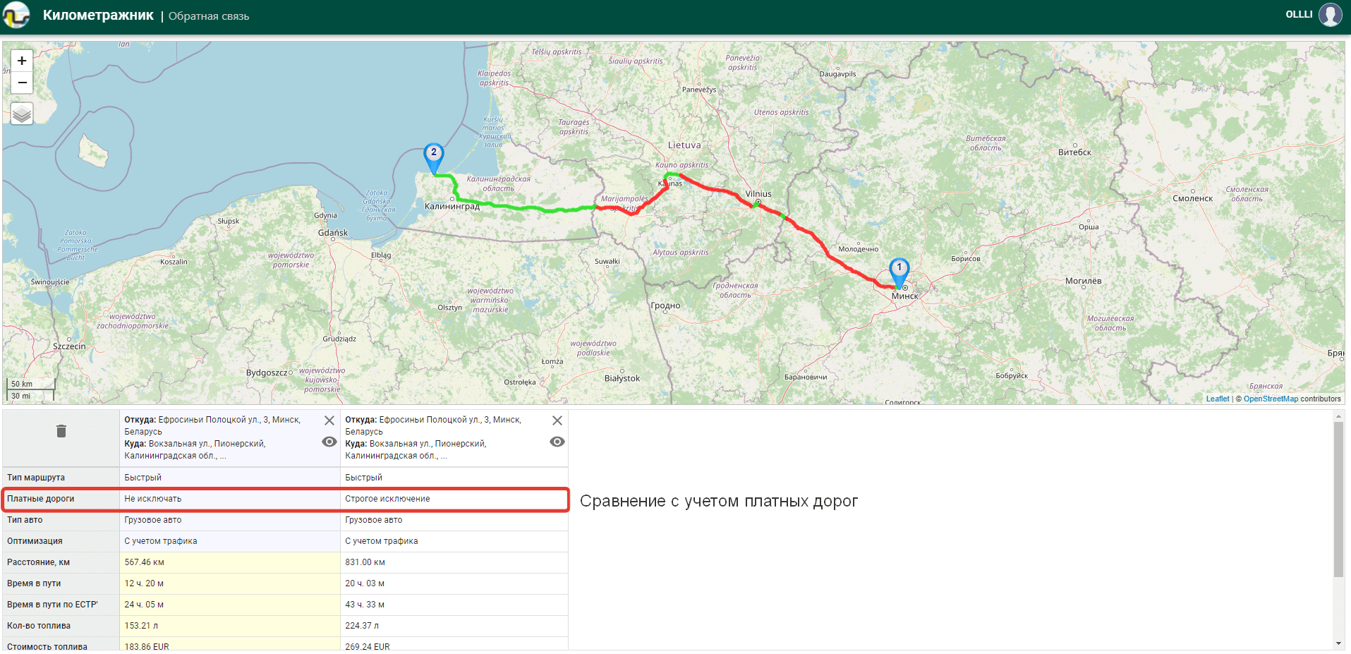 Любые изменения в параметрах маршрута отображаются в сравнительной таблице: длительность, километраж, стоимость и другие. Каждый маршрут из сравнительной таблицы можно раскрыть и просмотреть детали.