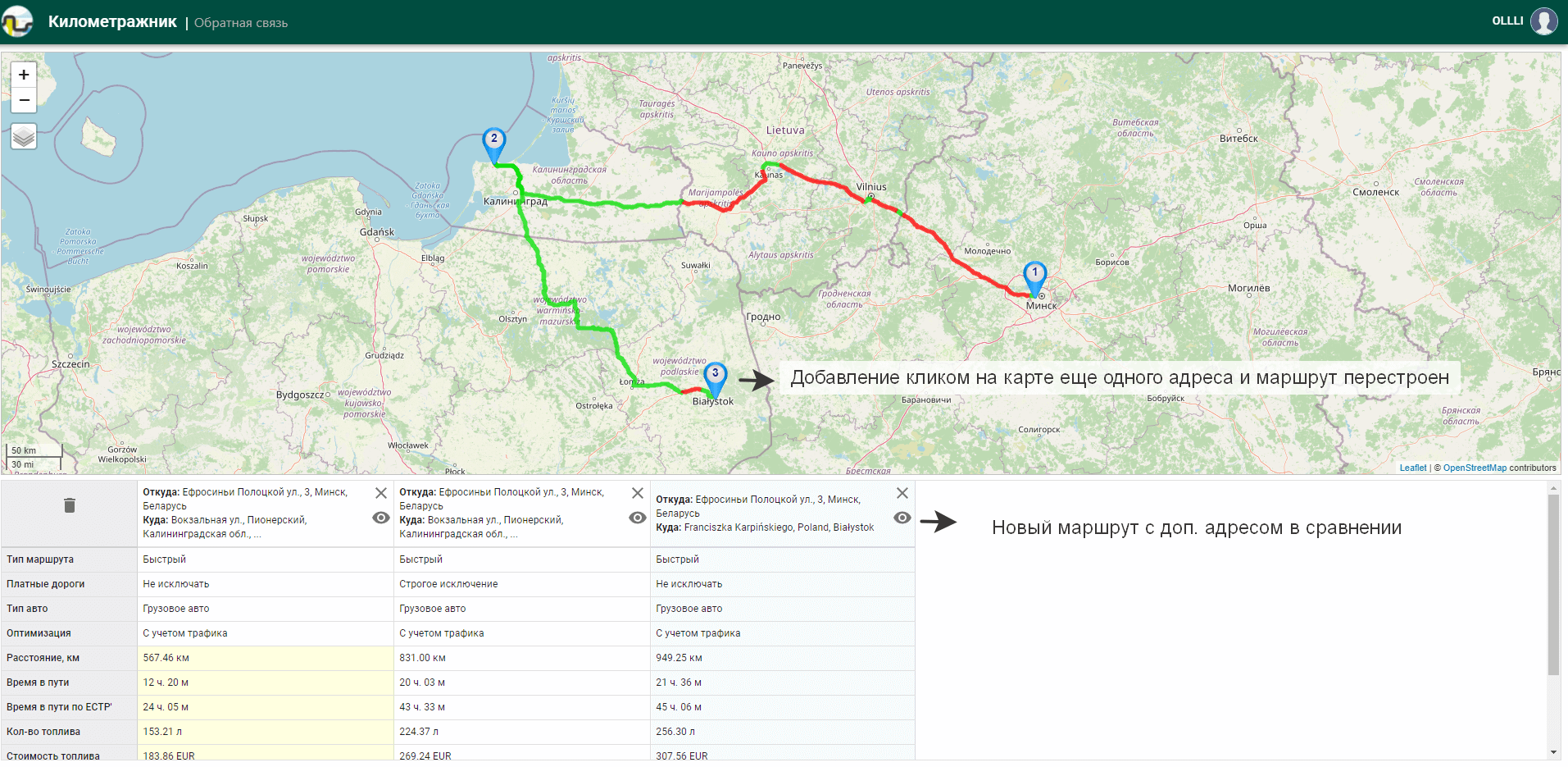 Любую точку маршрута на карте можно перетаскивать, и маршрут автоматически перестраивается. Более того он также попадает в сравнение.