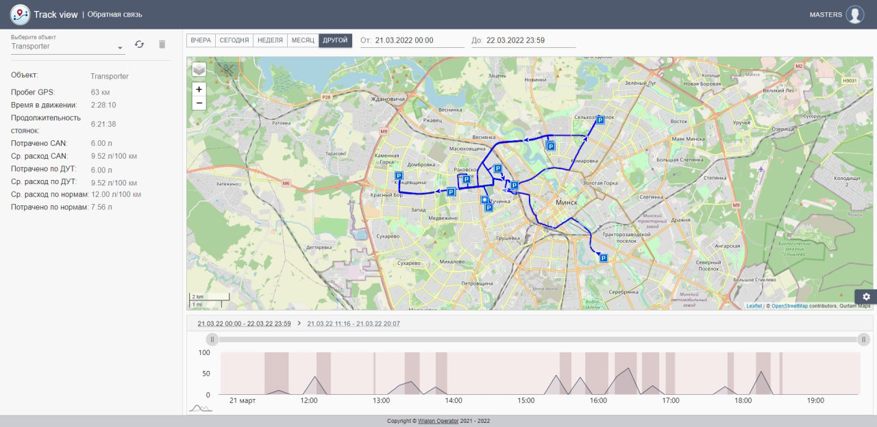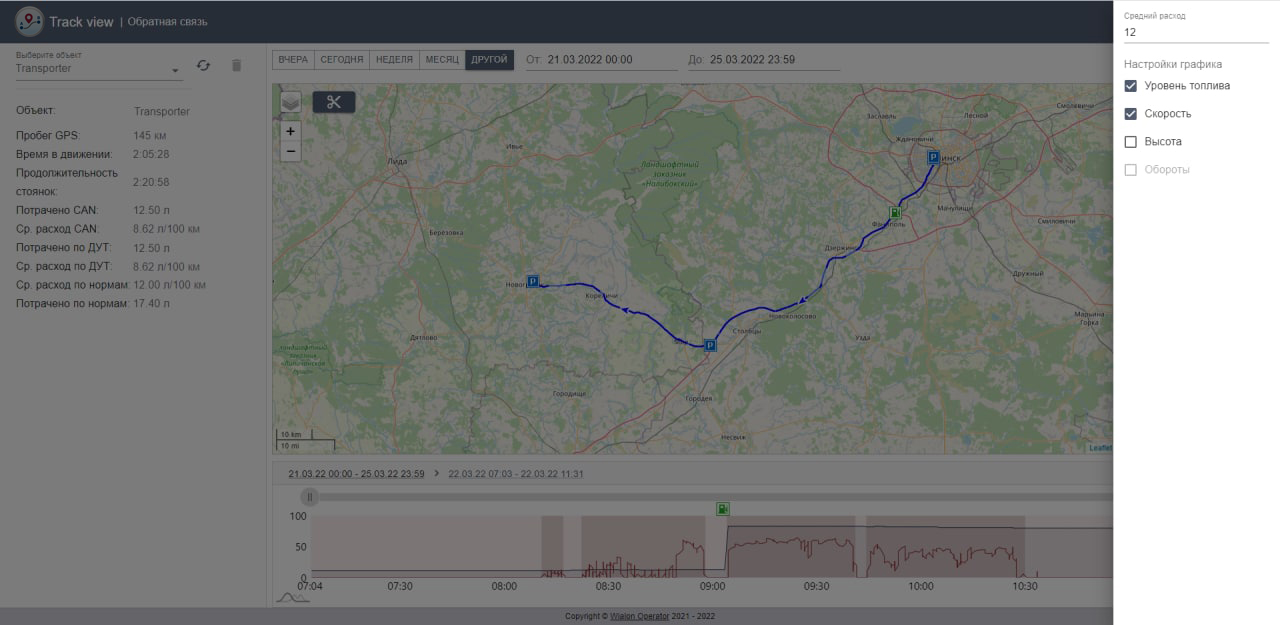 Отображение различных графиков: скорости, уровень топлива, оборотов, высоты над уровнем моря (анализ рельефа местности), график нагрузки на ось и другие.