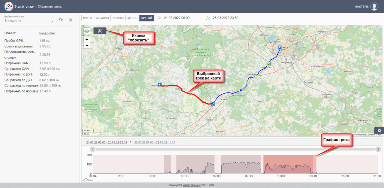Визуализация данных на любом участке трека на карте с использованием графиков и возможность детальной аналитики в удобных, индивидуально настраиваемых мини-отчётах.