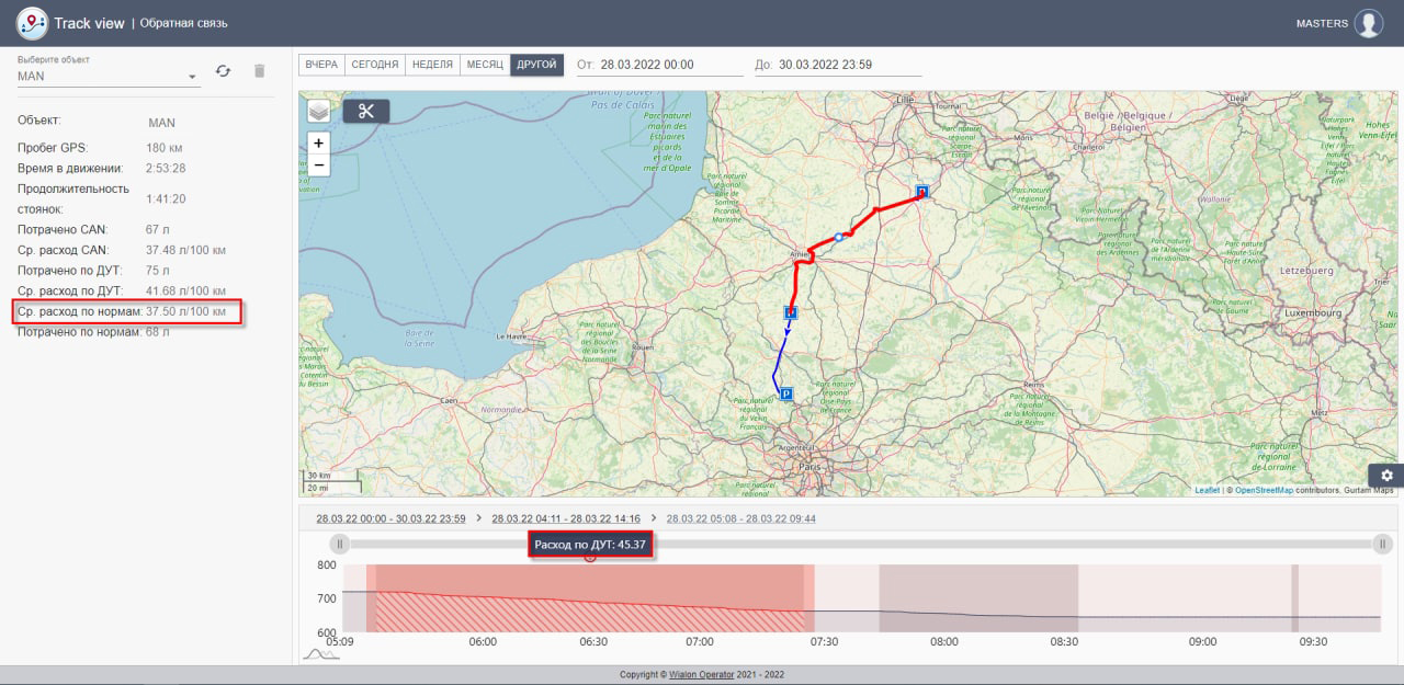 Участки маршрута, на которых автомобиль двигался с завышенным расходом топлива, приложение подсветит красным фоном с восклицательным знаком на графике уровня топлива.