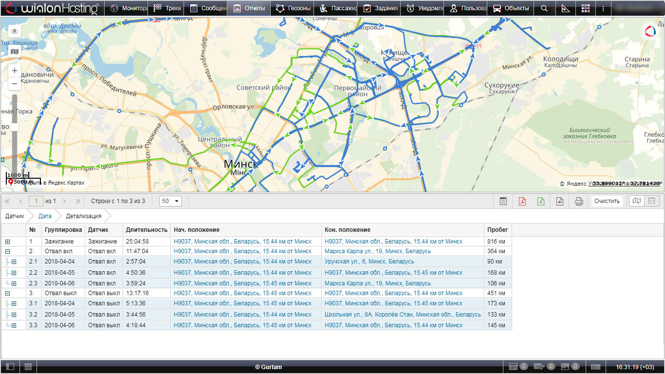 В системе Wialon Вам будет доступна аналитическая информация о начале и завершении работы каждой машины. Кроме этого, в отчёте Вы увидите периоды простоя и продолжительность рабочего времени.