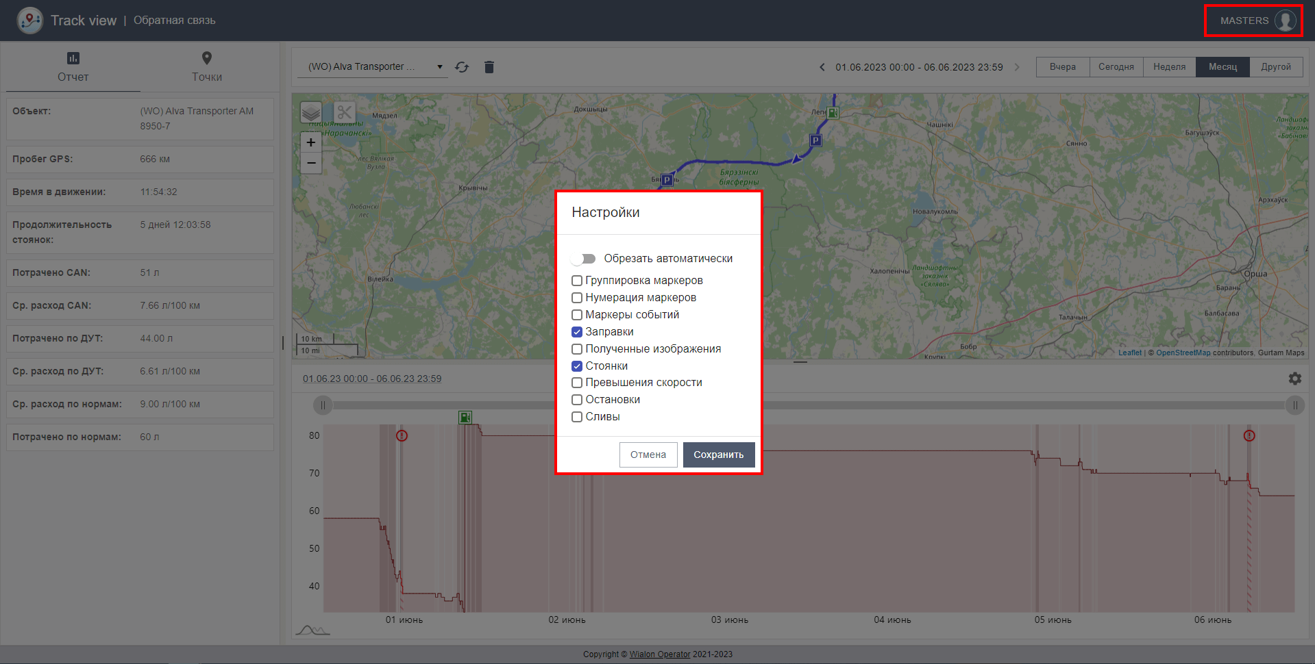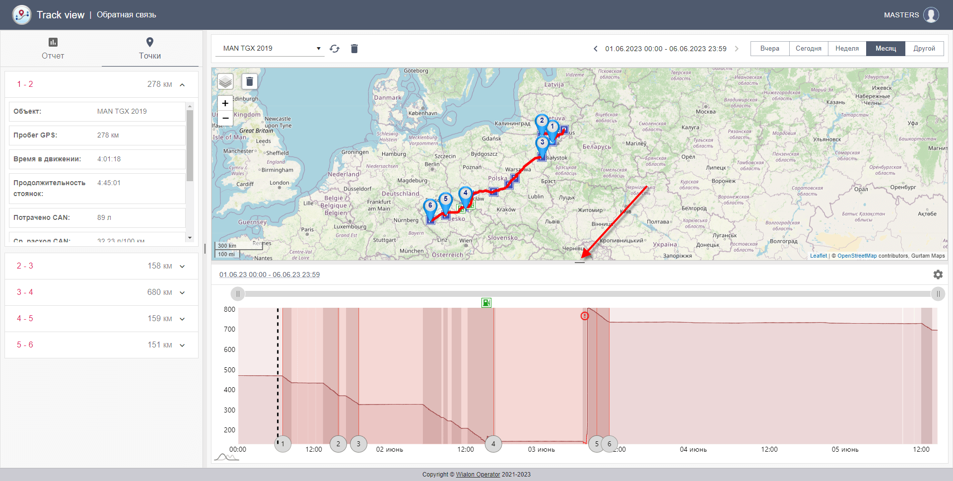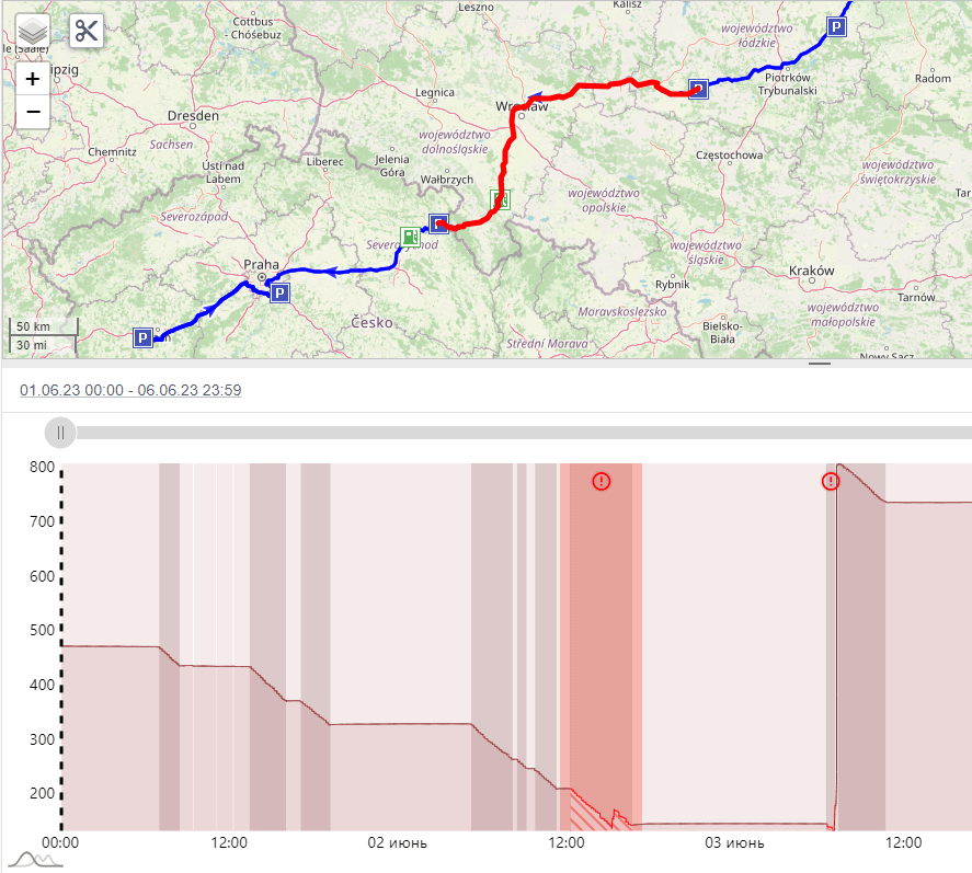 Такие участки система автоматически отображает красным фоном с восклицательным знаком на графике уровня топлива, а также можно выделить проблемный участок трека на карте красным цветом.