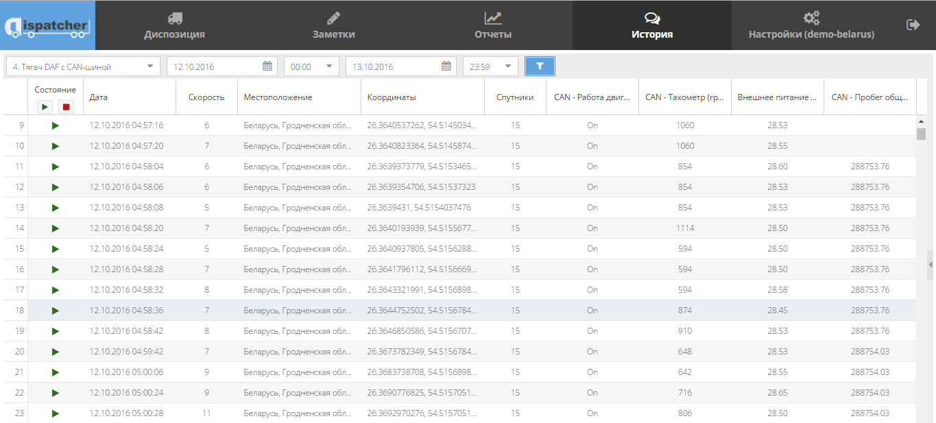 На вкладке “История” вы найдете историю передвижения транспорта и значений его датчиков за выбранный вами период, с возможностью поиска по значению.