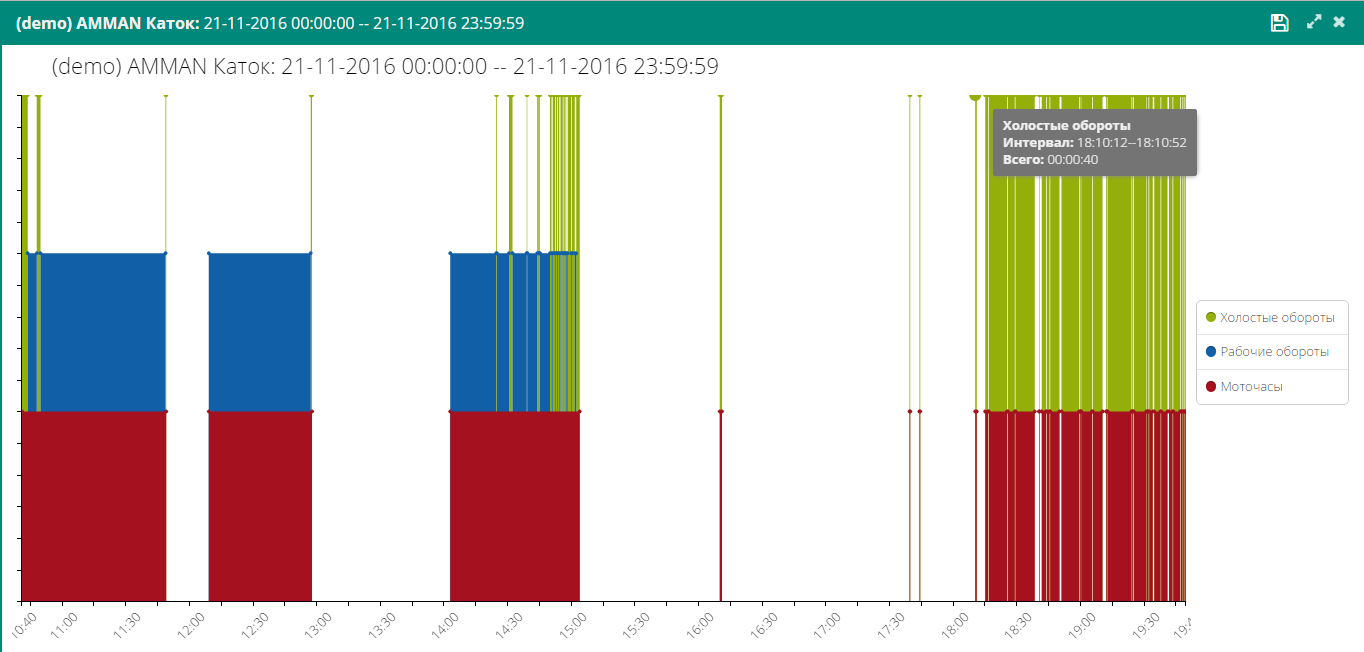 Они помогут Вам наглядно увидеть, в каких режимах спецтехника работала в течение всего дня. И например, в случае превышения длительности холостых оборотов – Вы точно определите, в какой момент времени произошло нарушение и какова была его продолжительность.