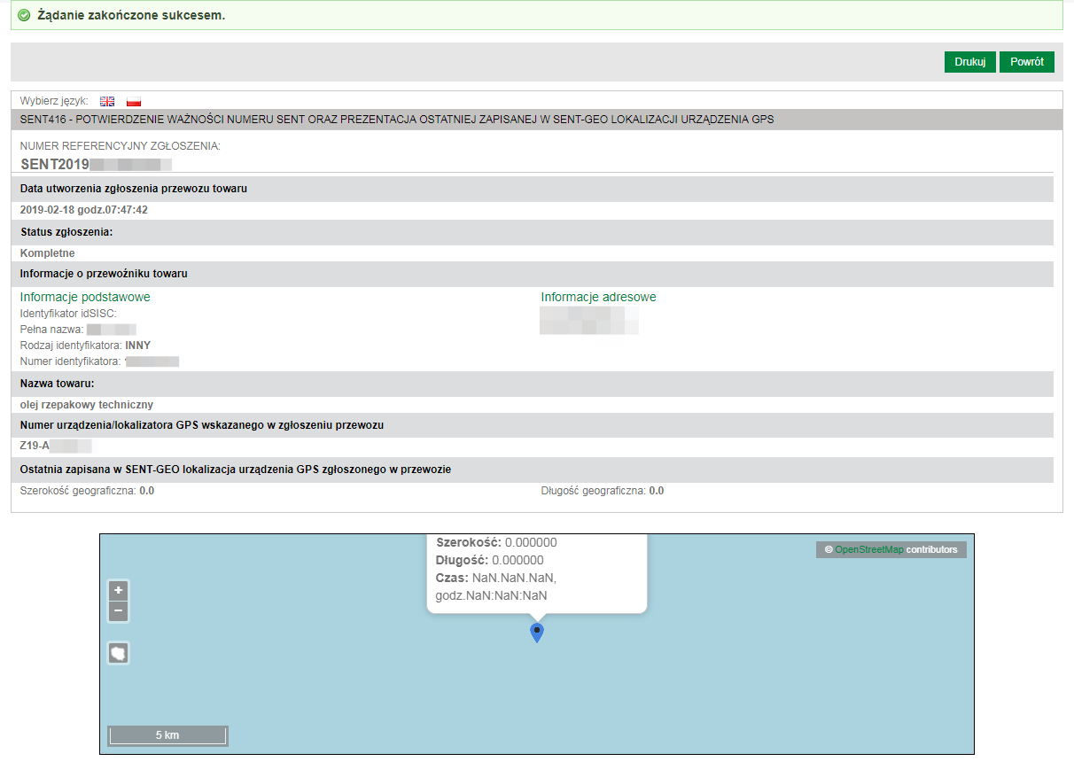 Если текущие координаты не соответствуют указанным — данные по авто отображаться не будут. Это специфика польской системы. Поэтому если машина к примеру, ещё в Литве, то данные в SENT передаваться еще не будут.