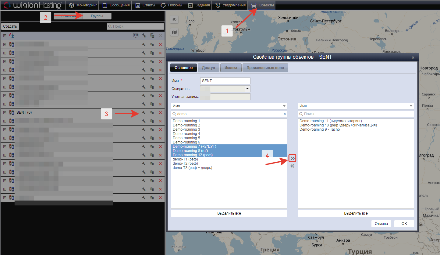 Шаг 2: В Вашей учётной записи Wialon создайте группы объектов. Название должно начинаться со слова “SENT…”, а дальше можно указать любое дополнение по Вашему желанию. Затем добавьте необходимые автомобили в новую группу, как показано на скриншоте.Пересылка данных начнется лишь тогда, когда автомобиль будет на территории Польши.