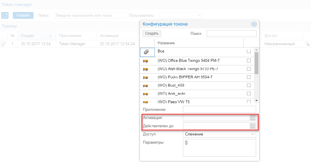 При создании токена Вы выбираете автомобили, а также время и уровень доступа к ним