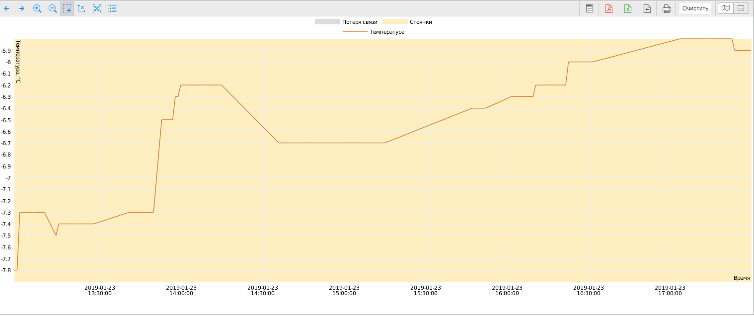 После установки базового комплекта по контролю температуры в Wialon Вам будут доступны отчёты и графики о температурных изменениях внутри прицепа.