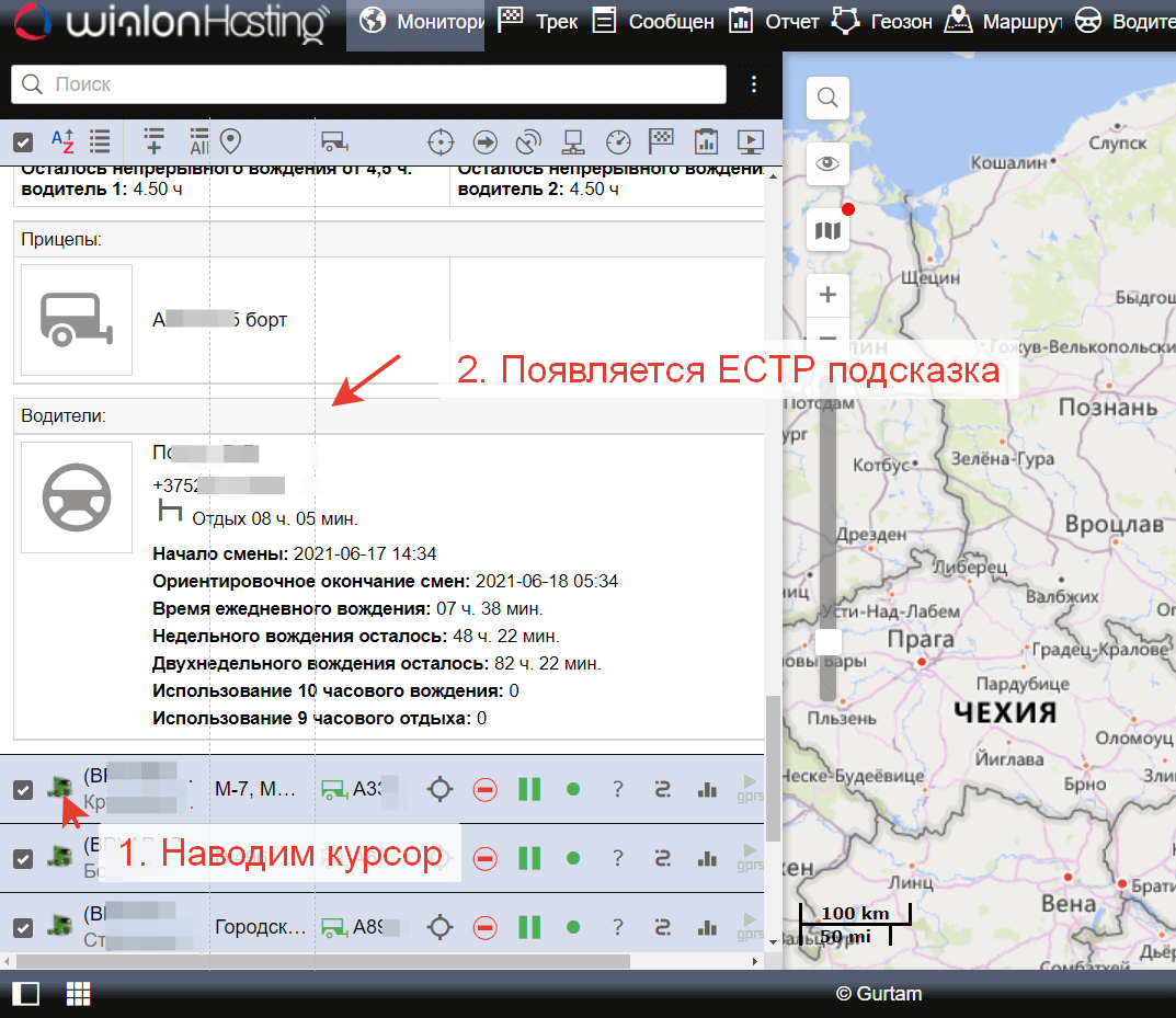 На вкладке “Мониторинг” в списке объектов при наведении курсором на значок “авто” появляется ЕСТР подсказка со всей необходимой информацией.