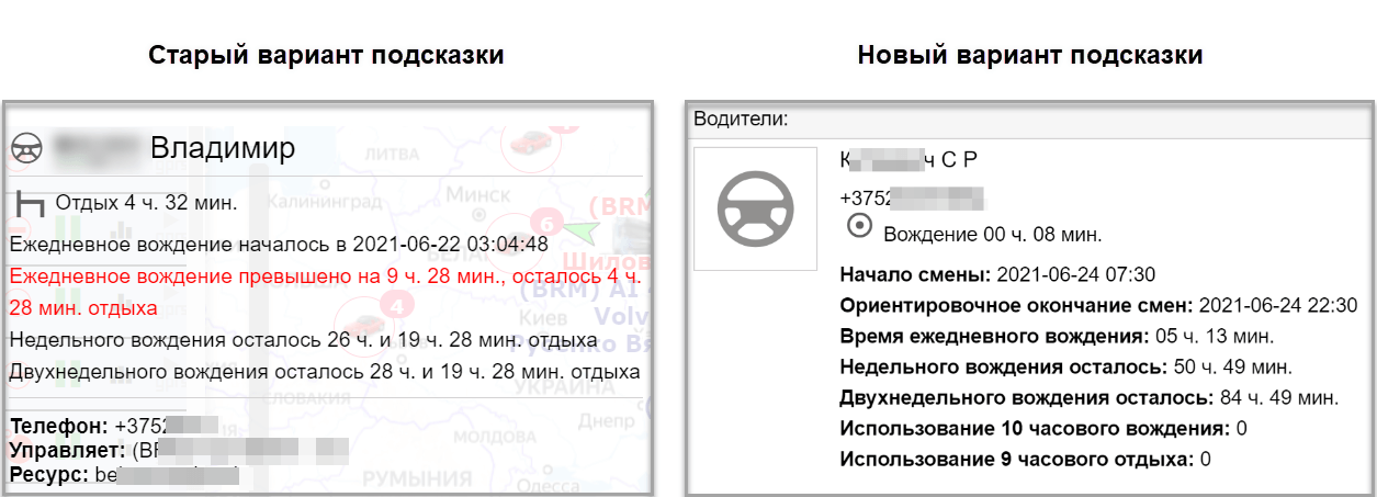 Фактически сразу, наведя курсором на выбранный объект, можно видеть всю необходимую информацию по активному водителю с учётом соблюдения норм ЕСТР, оперативно оценивать и своевременно принимать решения. Все важные пункты уже рассчитаны, систематизированы и находятся в одном месте. Ниже представлены варианты старой подсказки и новой.