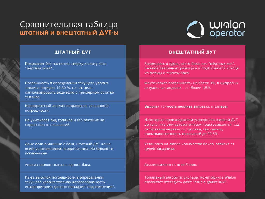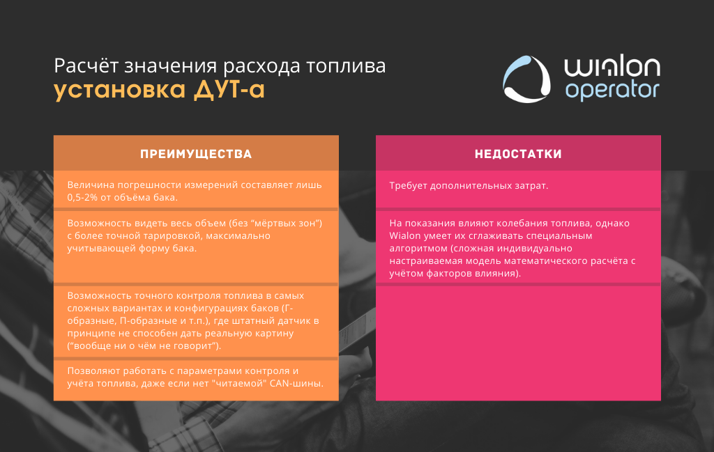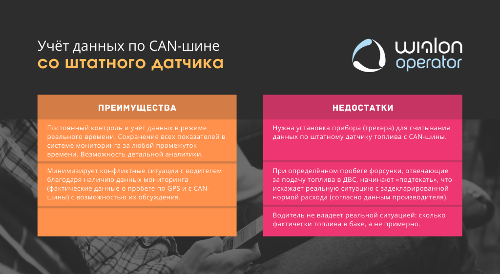 И здесь на ум приходит пословица: каждый кулик свое болото хвалит. Одни утверждают, что учёт данных по CAN-шине со штатного датчика самый точный, другие – нужна установка дополнительных датчиков топлива (ДУТ), третьи – зачем тратиться, и по нормам можно контролировать. Итого, варианты есть и они разные. Важно выбрать тот, который подойдёт именно вам и будет справляться с вашими задачами.