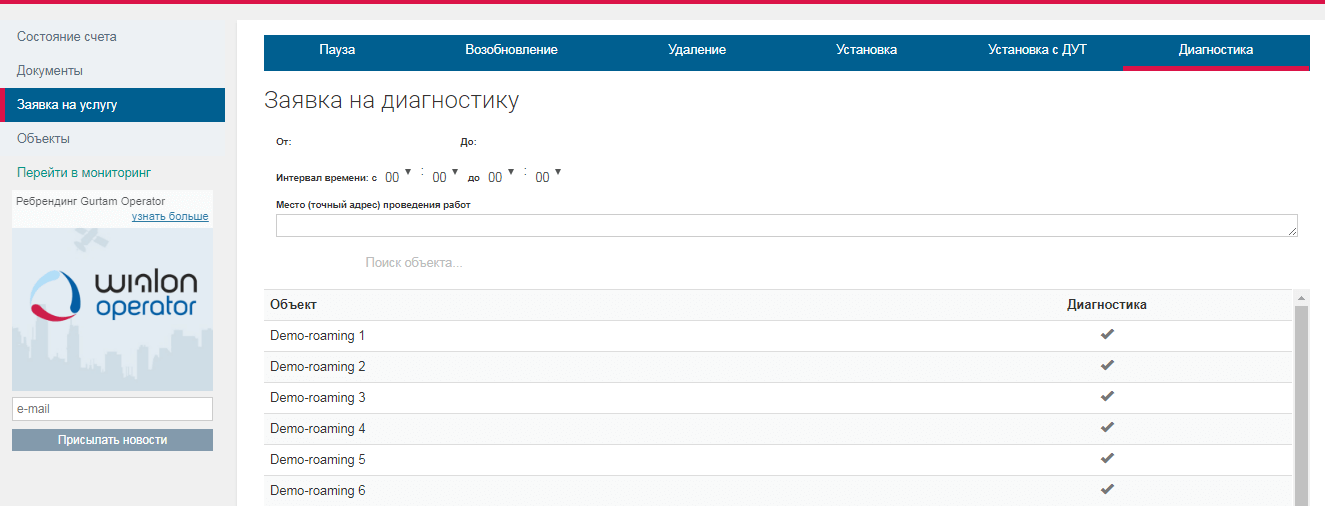 Мы внесли значимые изменения на вкладке Заявка на услугу – появилось 3 новых типа заявок: "Установка", "Установка с ДУТ" и "Диагностика". Установка В окне заявки на установку Вы можете указать предпочтительное для Вас время монтажа GPS оборудования на автомобиль. Также стоит внести контактные данные ответственных за проведение установки от Вашего предприятия.