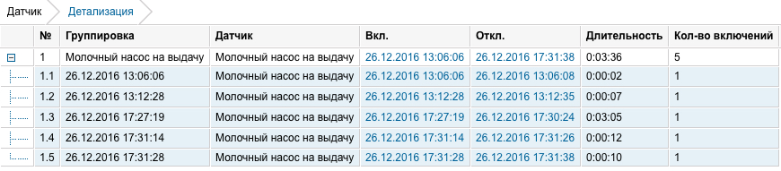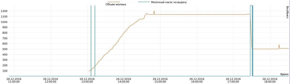 Обратите внимание на временной интервал с 17.00 до 18.00. Здесь мы видим время работы насоса на выдачу, а также можем узнать объём отгруженного молока. Графики можно было выводить как для каждого агрегата в отдельности, так и для нескольких сразу на одном экране.