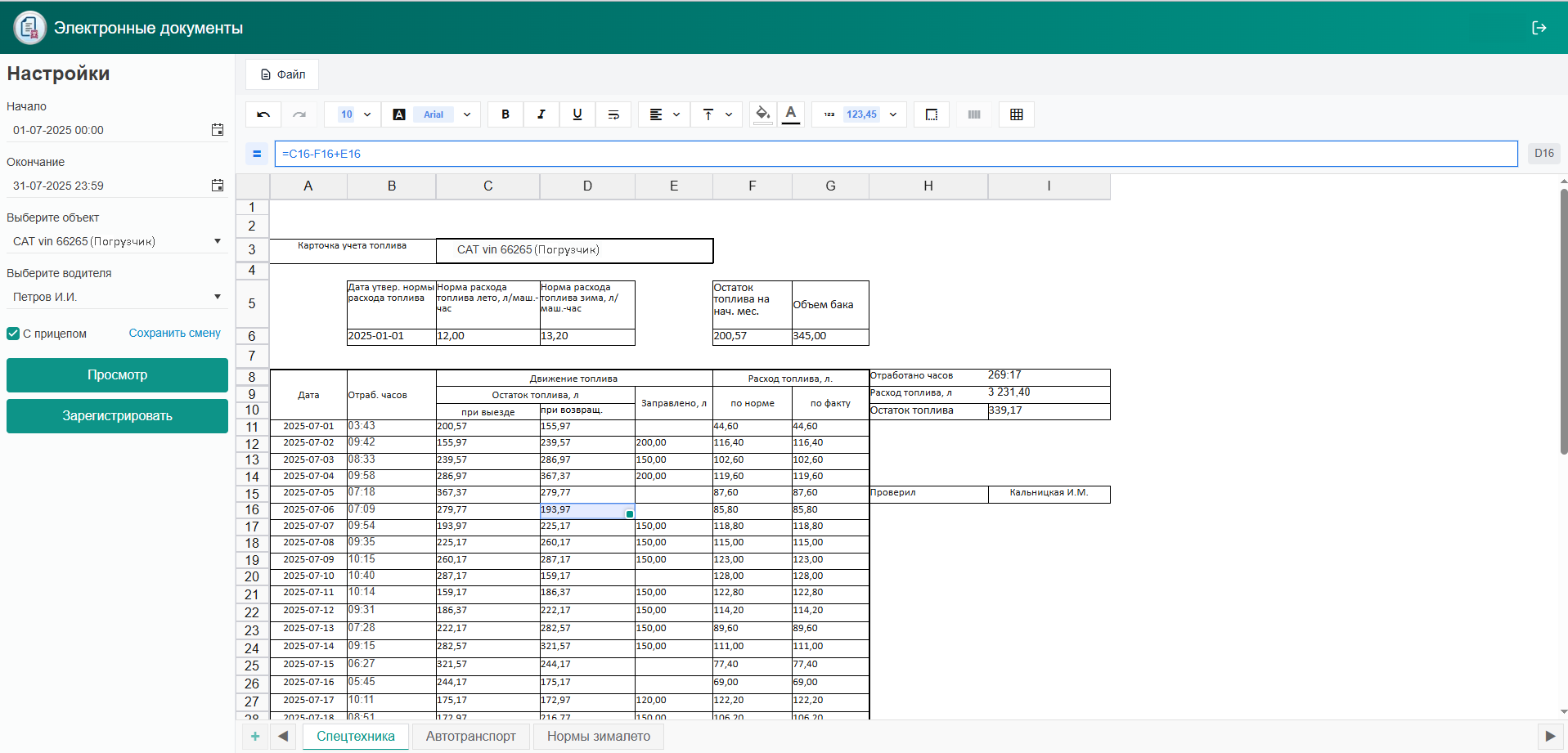 Мы разработали веб-приложение “Электронный документ”, которое автоматизирует работу с путевыми листами. Приложение позволяет работать не только с путевыми листами, но и с любым excel-документом, где требуется расчет движения и остатков топлива, километража, рабочего времени водителей, техники или любой другой установки.