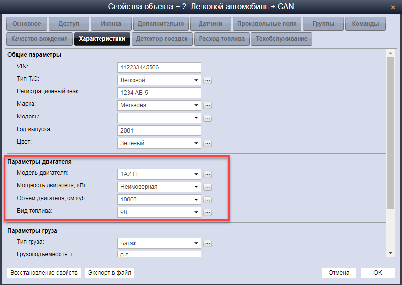 Вкладка характеристики была визуально разделена на 3 блока: «Общие параметры», «Параметры двигателя» и «Параметры груза».