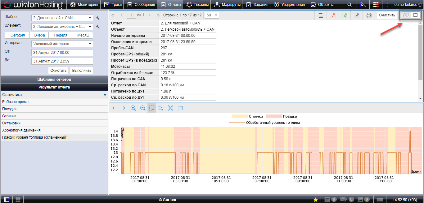 В обновлённой версии Wialon Hosting у вас появился выбор! Вы можете оставить прежний вариант. Или же можно переключить вид окна на «график/график» («таблица/таблица»), тогда карта пропадёт, а её место займет другая вкладка отчёта - например, таблица.