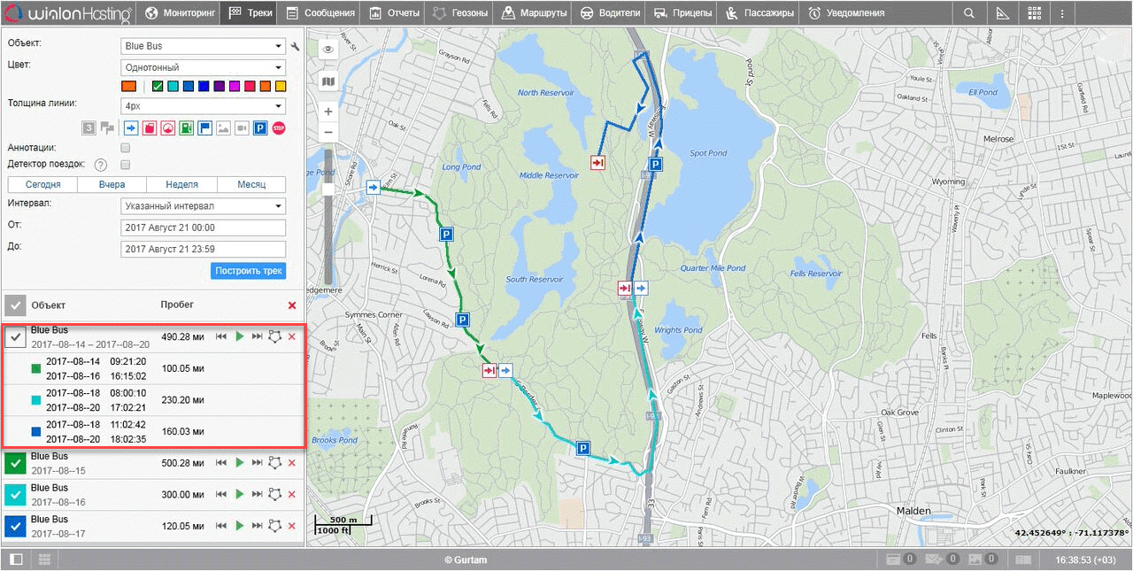 На карте Вы увидите трек, разделённый на отрезки разных цветов. Начало и конец каждой поездки обозначены специальным маркером.
