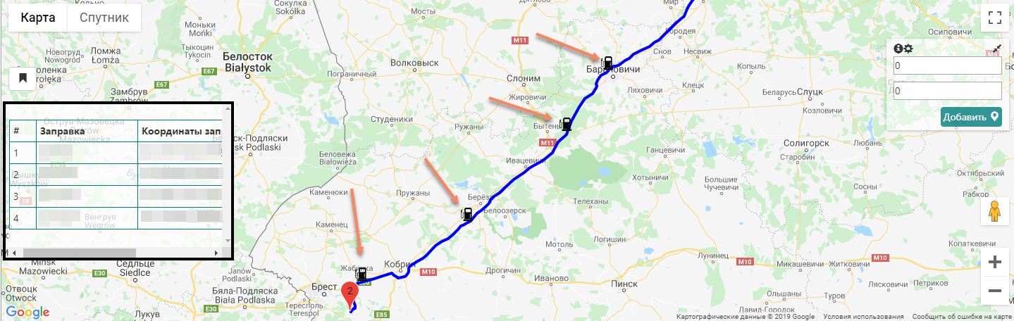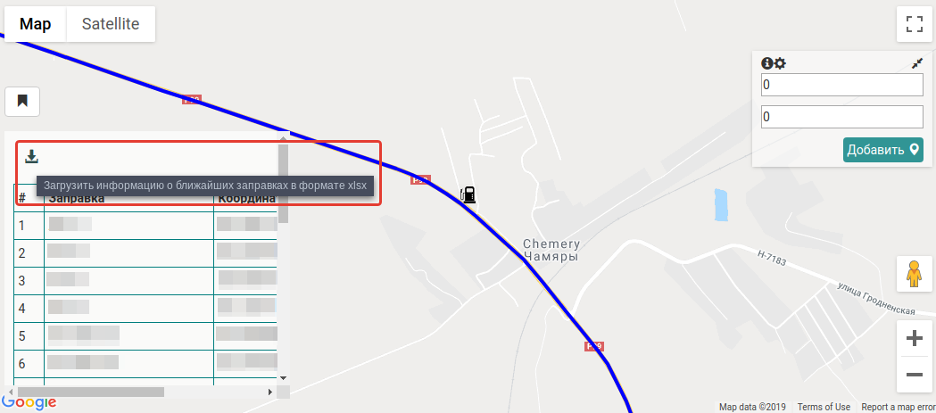 При нажатии на кнопку точки (в данном случае заправки) сразу же будут отображены на карте, а также рядом появится таблица с их названием и координатами, которые вы можете скопировать: