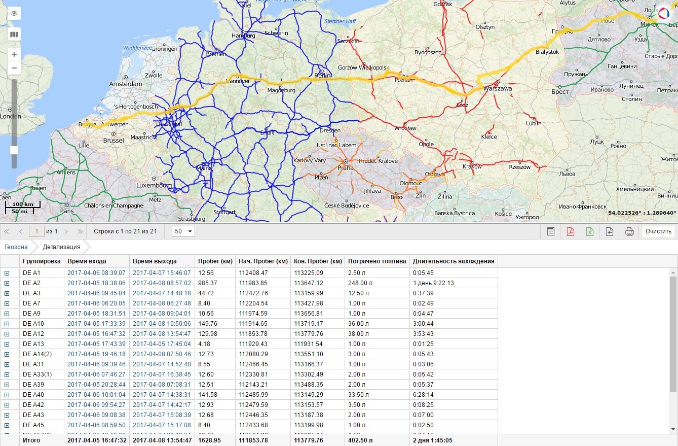 А при выполнении отчета Вам будет доступна информация о точном времени входа/выхода из геозоны, фактическом пробеге на платном участке, длительности следования, расходе топлива и других параметрах, необходимых Вам для анализа.