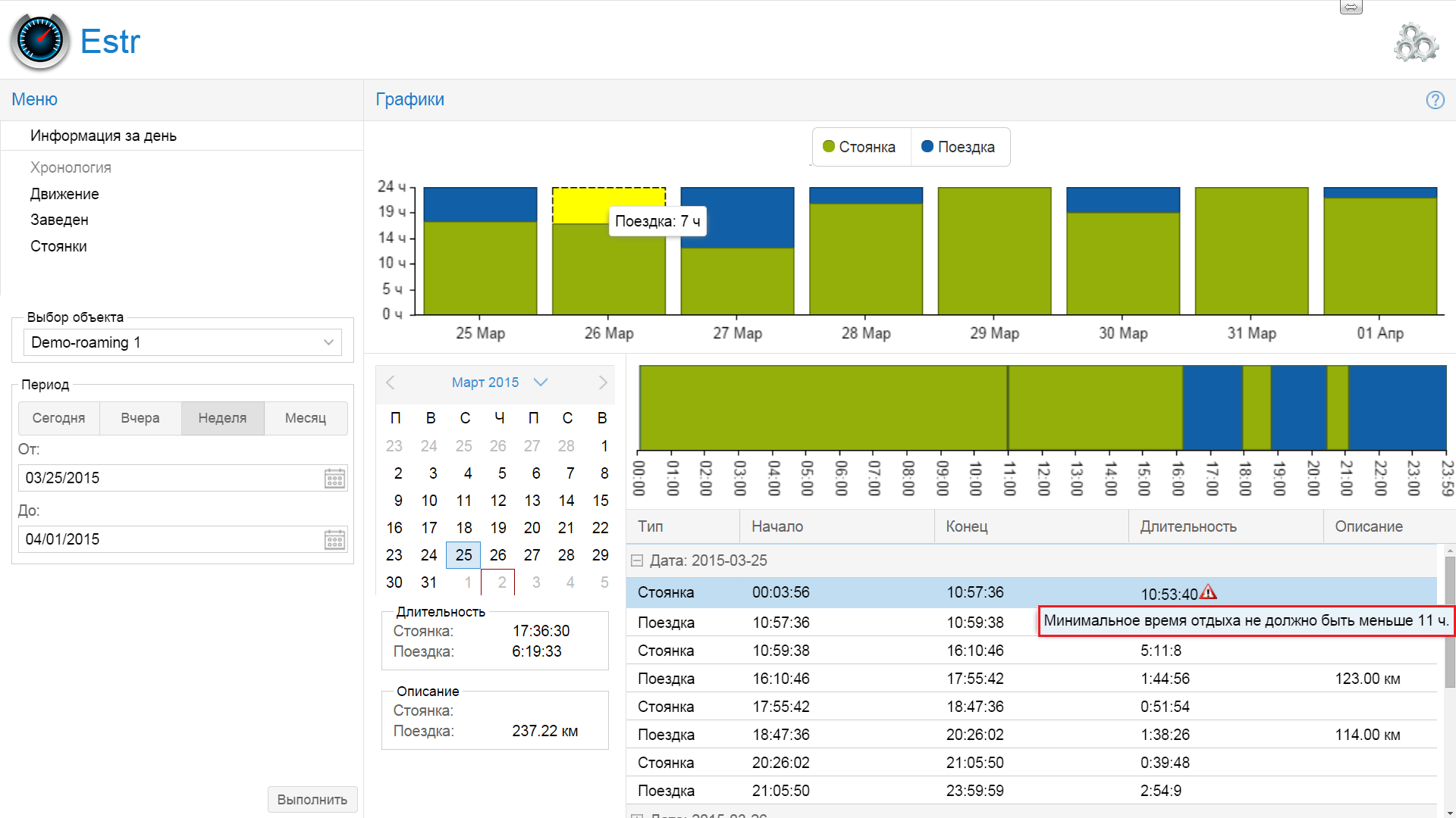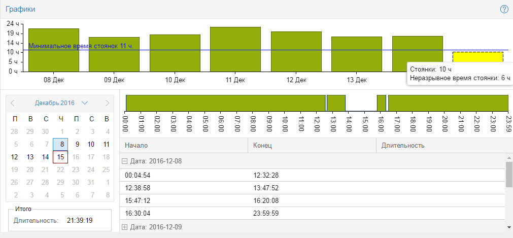 В нижнем графике вы найдете более детальную информацию по каждому дню: время начала/завершения движения или стоянки, общая длительность и пройденное расстояние.