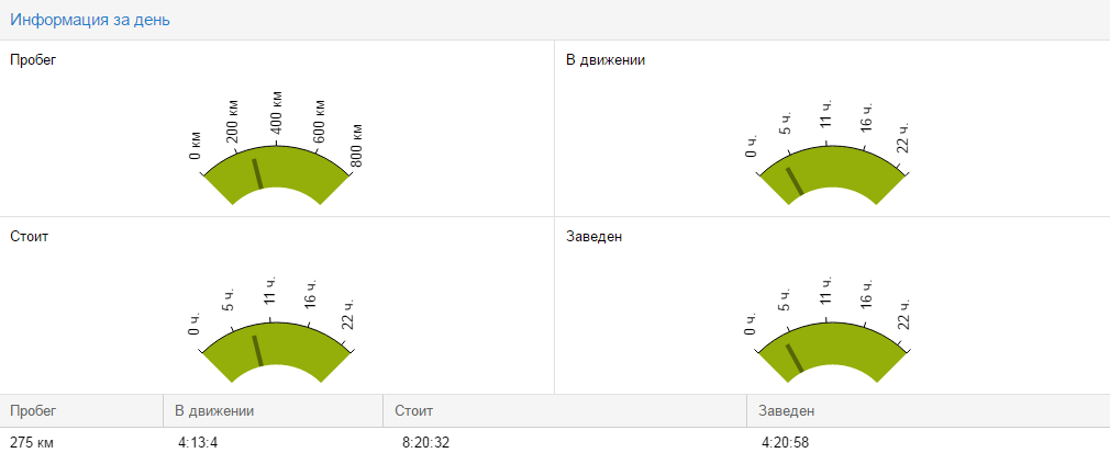 В отчете вы увидите общие показатели работы по каждому водителю за выбранный день. Вы сможете проанализировать пробег автомобиля, время в движении, а также продолжительность стоянок и работы двигателя.