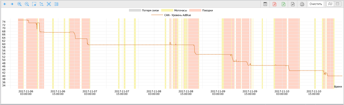 Вы также можете отследить динамику уровня AdBlue в течение всей поездки при помощи построенного в системе графика или отчёта.