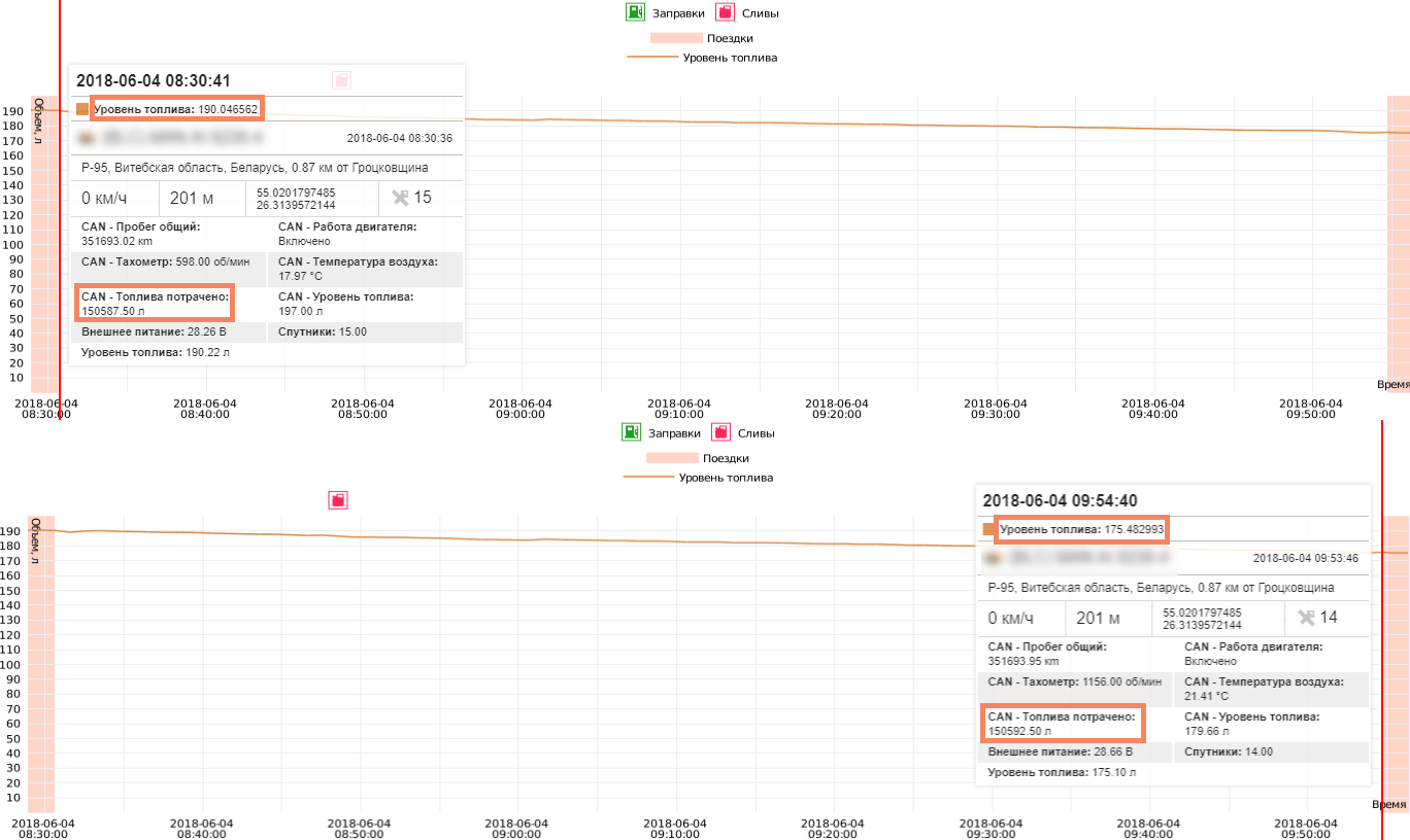 Анализ: На начало погрузочно-разгрузочных работ в 8:30 уровень топлива по ДУТ составлял 190л, показатель абсолютного расхода топлива по CAN (по форсункам) ― 150587,5 л. По окончании погрузочно-разгрузочных работ в 9:54 (спустя 1ч 20 мин) уровень топлива по ДУТ был равен 175 л, а расход по CAN ― 150592,5 л.