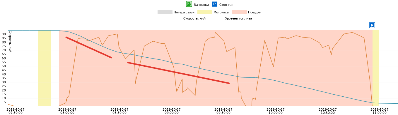 Наклон синей линии графика уровня топлива более сильный в начале поездки (что говорит о повышенном расходе) и более ровный в основной части поездки.