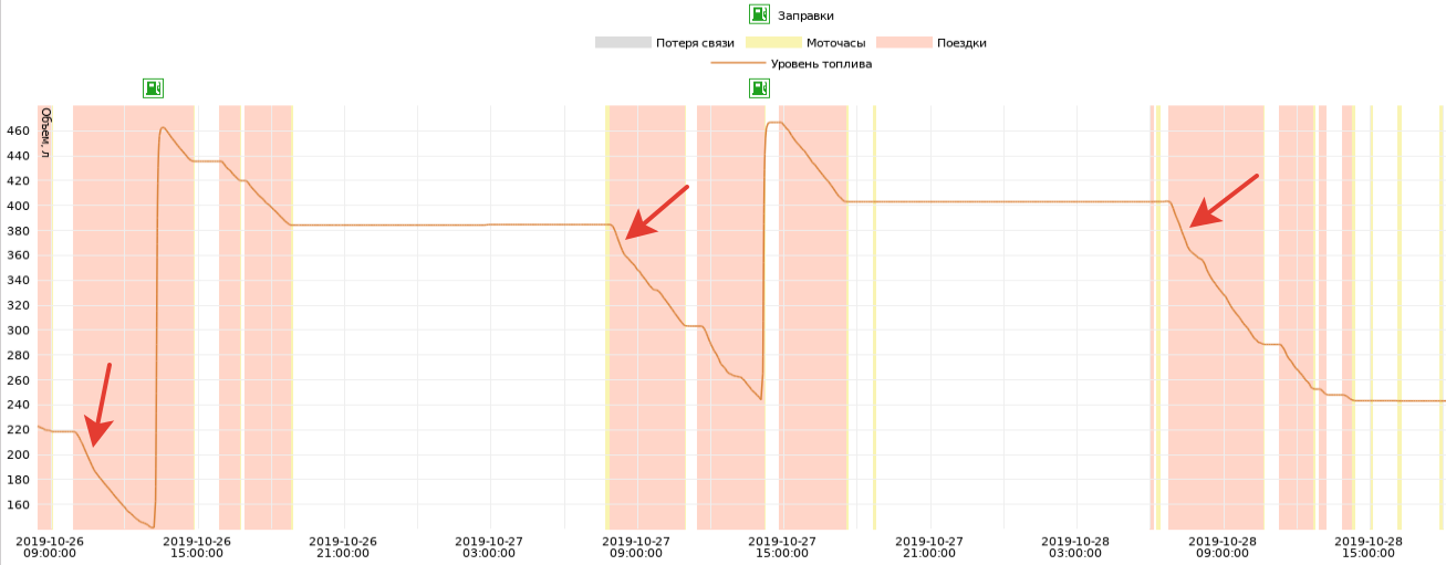 И если оценить график за несколько дней, то видно, что эти сливы происходят всегда в начале поездки после стоянок:
