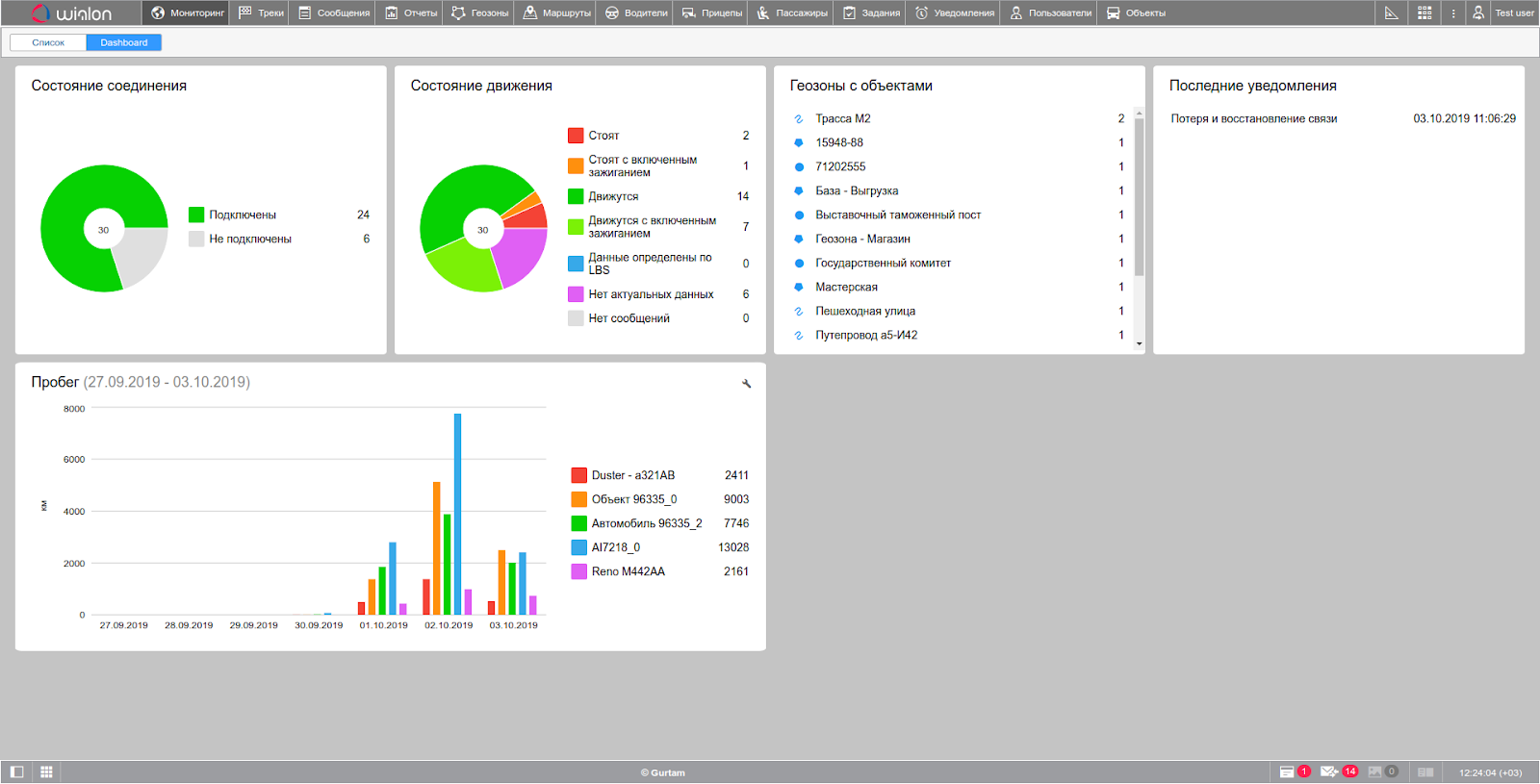 Основные показатели по автопарку могут отображаться в виде графиков и диаграмм — просто переключитесь на режим Dashboard.