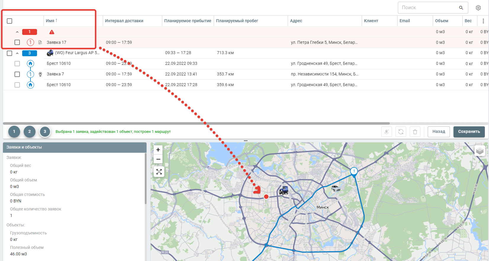Заявки, которые не попали в маршрут по каким-либо причинам, которые не были обозначены как приоритет, программа подсветит красным.