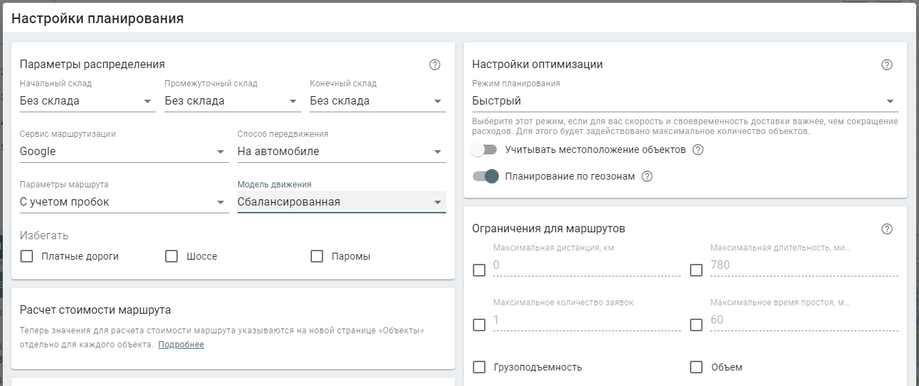 Всего доступно 3 режима планирования: быстрый, экономичный, сбалансированный. Здесь выбор между скоростью доставки и затратами. Также можно задать максимальное время простоя. Это поможет точнее прогнозировать общее время доставки.
