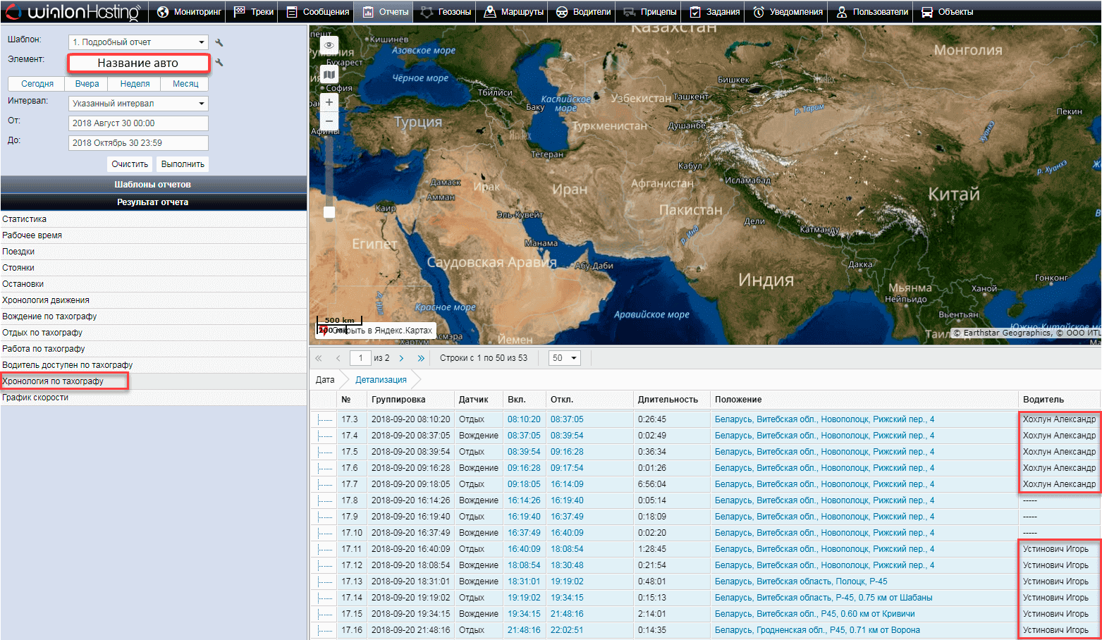 Если установленный у Вас трекер поддерживает подключение к тахографу и Вы хотите отследить работу всех водителей на интересующем Вас автомобиле, предлагаем Вам использовать таблицы с названием соответствующего режима в Подробном отчёте (например, “Хронология по тахографу”). Обращаем Ваше внимание, что данный отчёт строится по наименованию транспорта.