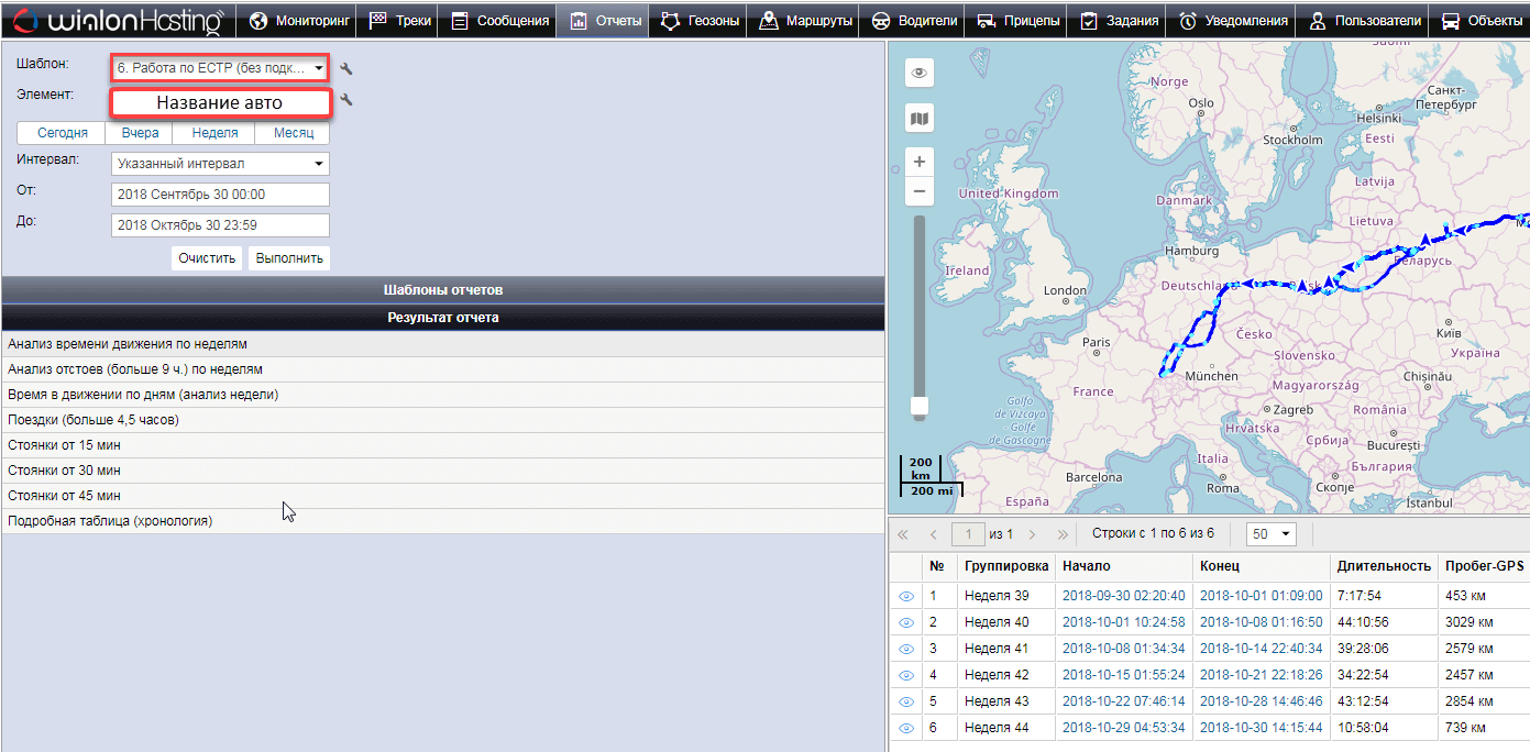 Если установленный у Вас трекер не поддерживает подключение к тахографу, Вы можете воспользоваться отчётом "Работа по ЕСТР (без подключения к тахографу)". И на основании gps-данных о перемещении транспортного средства Вы получите информацию обо всех стоянках и поездках. Далее Вы самостоятельно сможете сравнить результаты с нормами ЕСТР. Выберите интересующий Вас автомобиль ― и Вы получите вот такой отчёт.