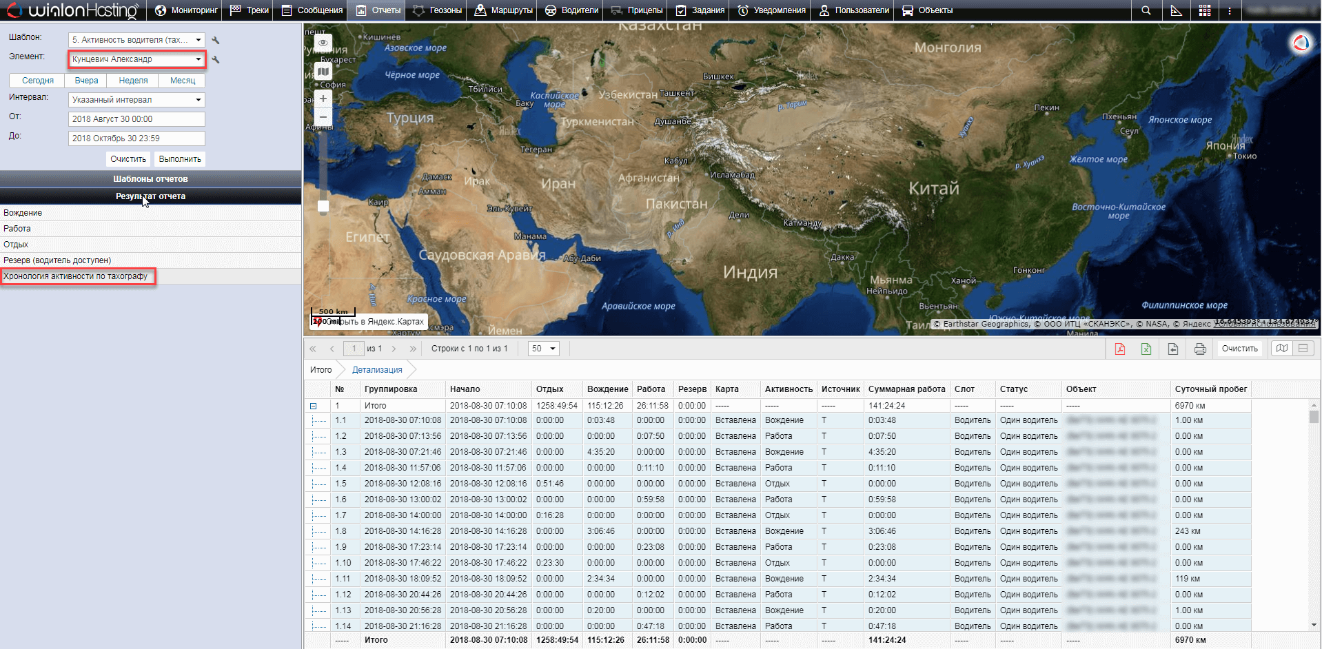 Если установленный у Вас трекер поддерживает подключение к тахографу и Вы хотите проверить режим работы и отдыха одного конкретного водителя, воспользуйтесь шаблоном отчёта “Активность водителя (тахограф)”.