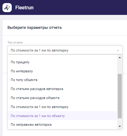 Во вкладке “отчёты” можно выбрать тип по: автопарку, объекту, водителю, по статьям расходов, по заправкам и т.п. Особое внимание заслуживает возможность отчёта по стоимости как за 1км. по автопарку, так и по 1 км. по объекту.