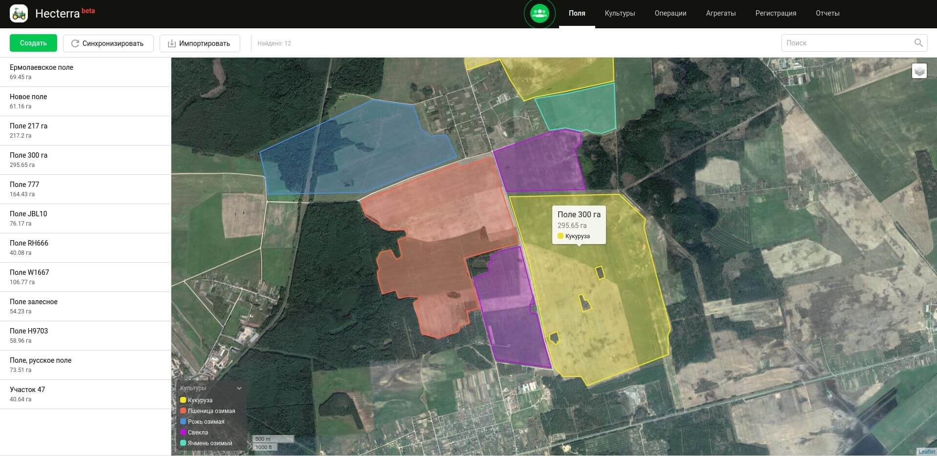 В Hecterra можно создавать поля-полигоны, загружать их из NewApex или импортировать из файлов. Также есть возможность задавать севооборот каждого поля, отмечать, что и в какой период вы выращиваете. Если вы указываете, какая культура произрастает на поле, в приложении оно окрашивается в определенный цвет.