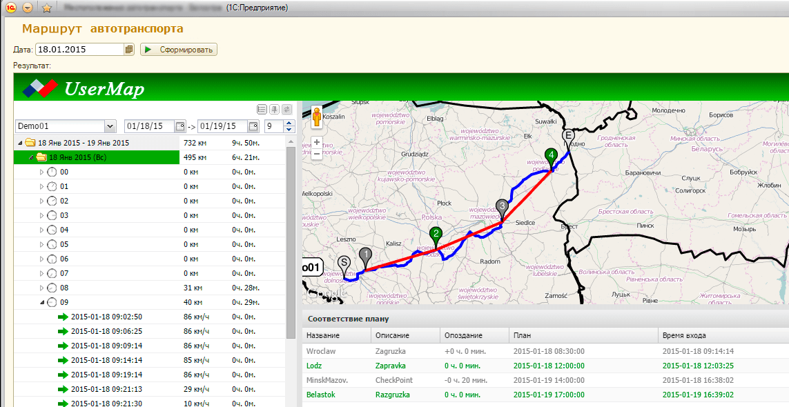 Также Вы сможете в интерфейсе 1С хранить данные о местоположении автопарка и просматривать трек движения машин на карте. Вам больше не придется постоянно переходить из 1С в систему мониторинга и наоборот для сверки путевых листов.